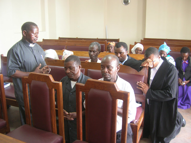 Leader of Marian Faith Healing Centre (MFHC), Fr Felician Nkwera, leads his followers for a prayer inside the courtroom on Tuesday shortly after the Court of Appeal directed that an appeal in which the group challenge ban to participate in Catholic Church services in Sumbawanga, and which was dismissed by the High Court in 2004 or being time barred, be heard afresh.