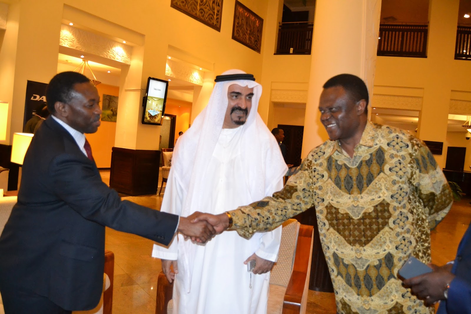 Balozi Mdogo wa Tanzania, Dubai Bw. Omar Mjenga (katikati) akimtambulisha Mhe. Lootah (wa kwanza kulia) kwa Mkurugenzi wa IPP Media Bw. Reginald Mengi walipokutana katika Hoteli ya Serena Jijini Dar es Salaam