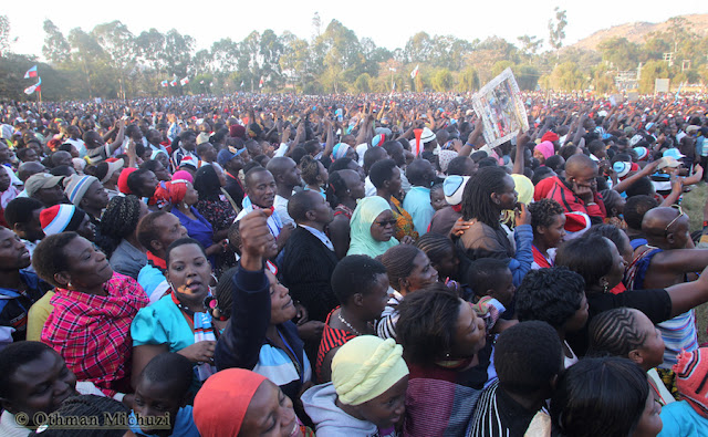 Sehemu ya Umati wa wananchi wa Mji wa Mafinga Wilayani Mufindi, wakionyesha fuaha yao kwa Mgombea Urais wa Jamhuri ya Muungani wa Tanzania katika mwamvuli wa UKAWA kupitia Chama cha Demokrasia na Maendeleo (CHADEMA), Mh. Edward Lowassa, katika Mkutano wa Kampeni za Chama hicho, Agosti 30, 2015.