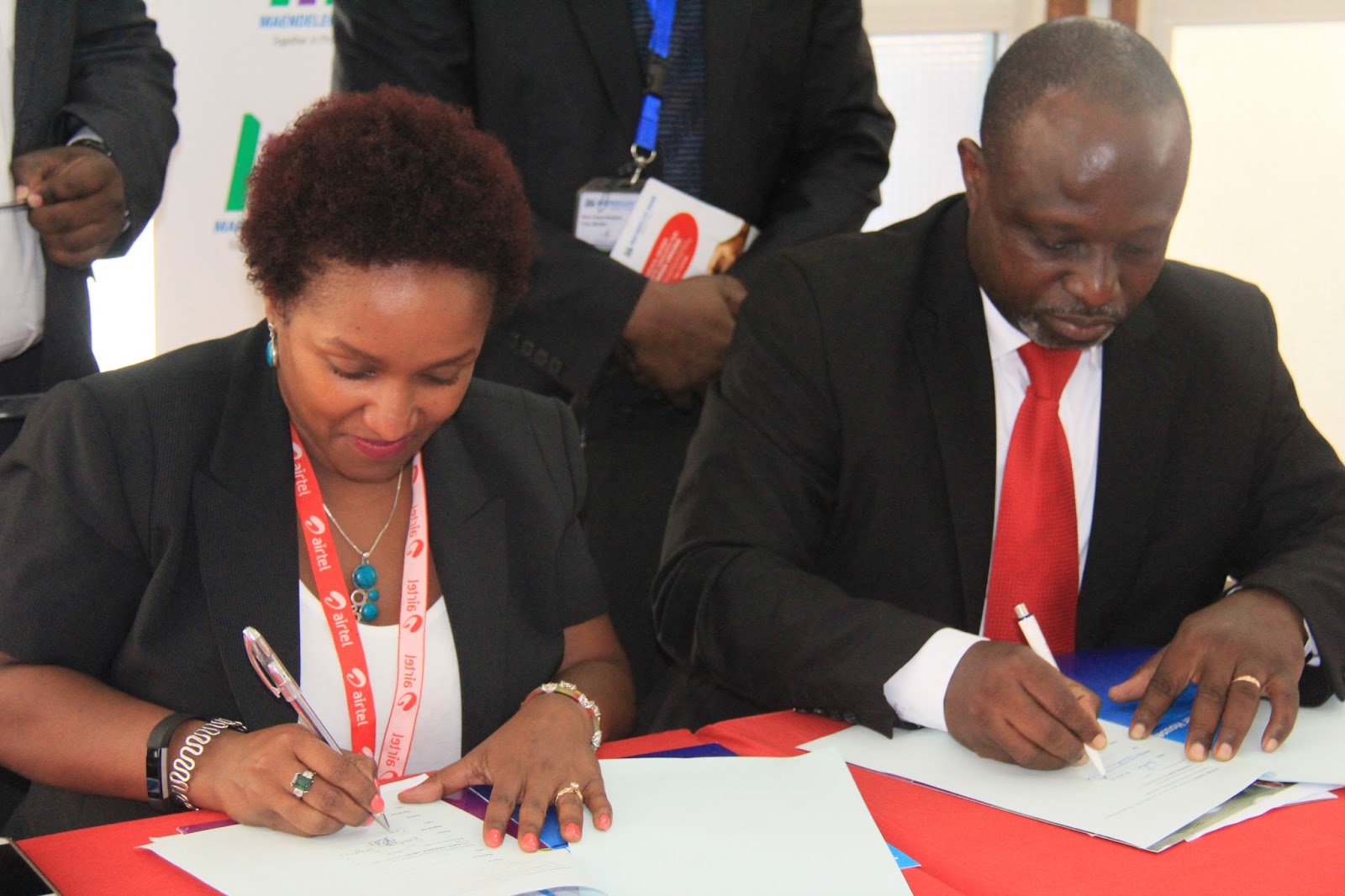 Mkurugenzi wa Mawasiliano wa Airtel Tanzania Bi. Beatrice Singano na Mkurugenzi Mtendaji wa Maendeleo Bank Bw. Ibrahim Mwangalaba wakibadilishana nyaraka baada ya kusaini makubaliano baina ya kampuni hizo mbili katika uzinduzi wa huduma mpya ya Timiza Vikoba.
